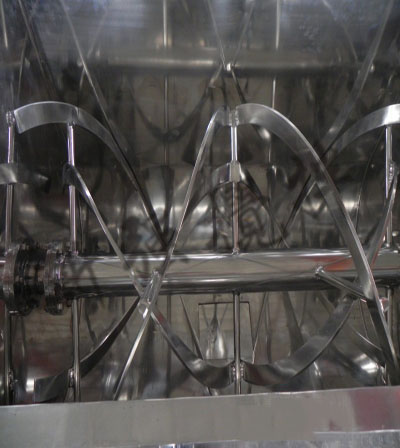 臥式螺條混合機(jī)由安裝于攪拌軸上的內(nèi)外徑螺條帶動(dòng)桶體內(nèi)物料,使攪拌器在桶體內(nèi)大范圍翻動(dòng)物料。攪拌器結(jié)構(gòu)上,螺條設(shè)計(jì)成內(nèi)外、左右互為反螺條,攪拌器工作時(shí)內(nèi)螺條帶動(dòng)靠近軸心處物料做軸心旋轉(zhuǎn),軸向由內(nèi)至兩側(cè)推動(dòng),外螺條帶動(dòng)靠近桶壁物料做軸心旋轉(zhuǎn),軸向由兩側(cè)至內(nèi)推動(dòng),于是造成物料在桶體內(nèi)對(duì)流循環(huán)、剪切滲混,完成物料在較短時(shí)間內(nèi)快速均勻混合。